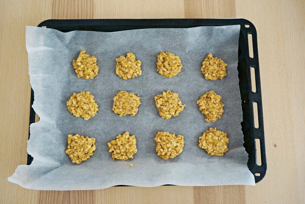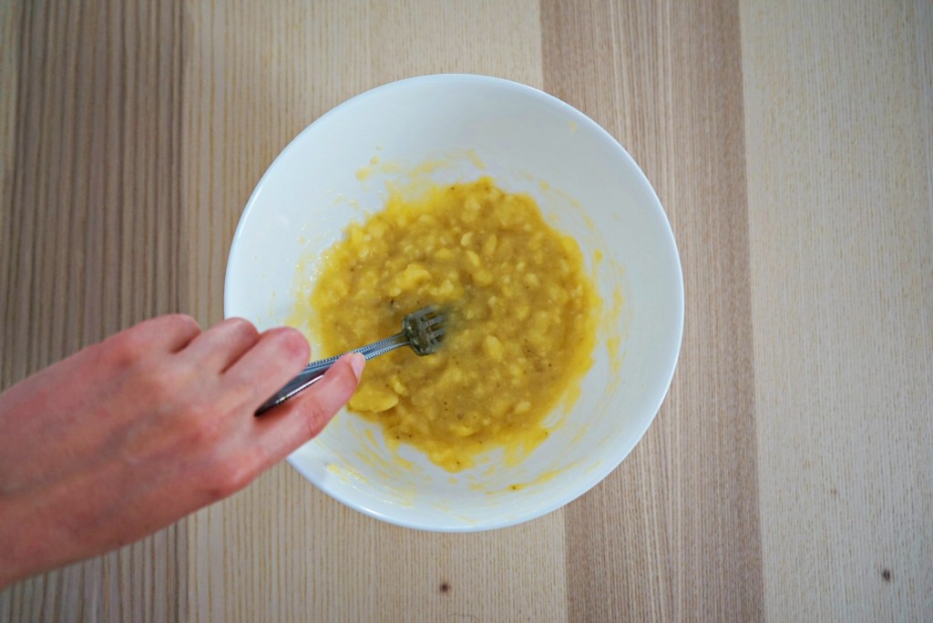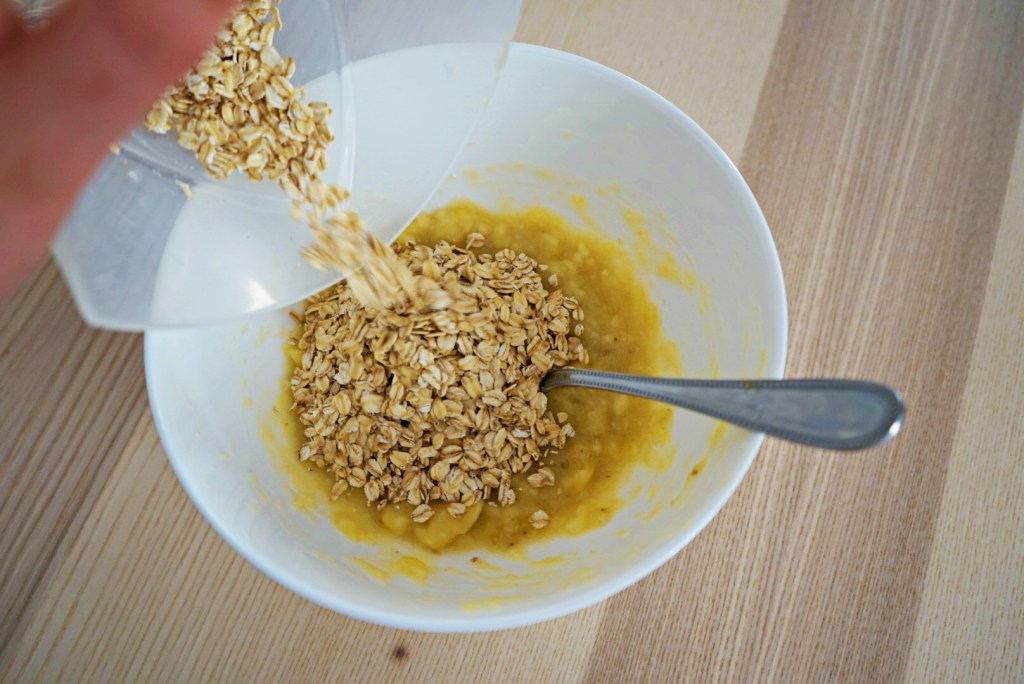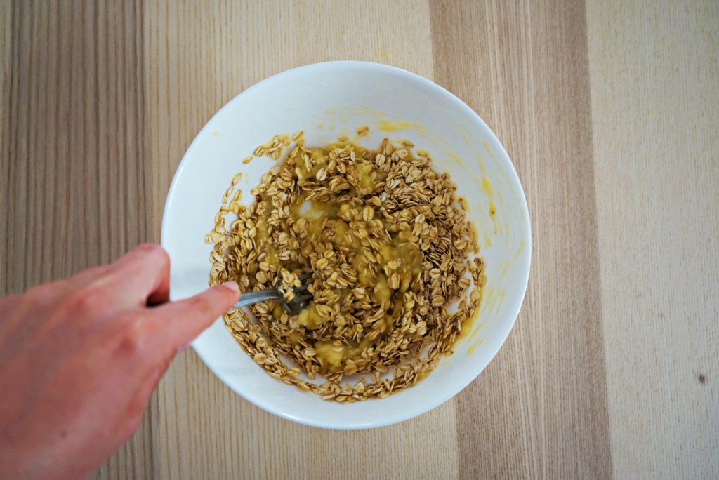 * Écrasez les bananes à la fourchette dans un bol jusqu’à obtenir une purée homogène puis ajoutez les flocons d’avoine et mélangez à nouveau.